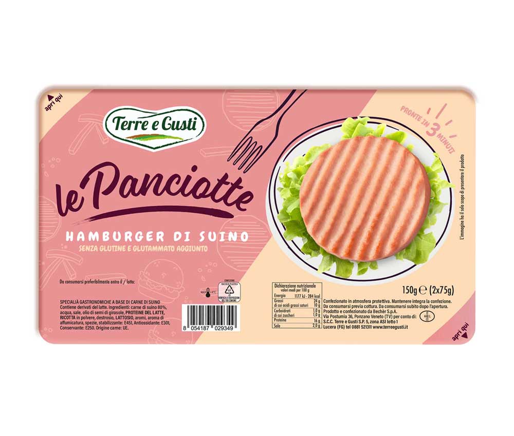 Le panciotte Terre e Gusti sono hamburger di suino senza glutine e senza glutammato aggiunto.