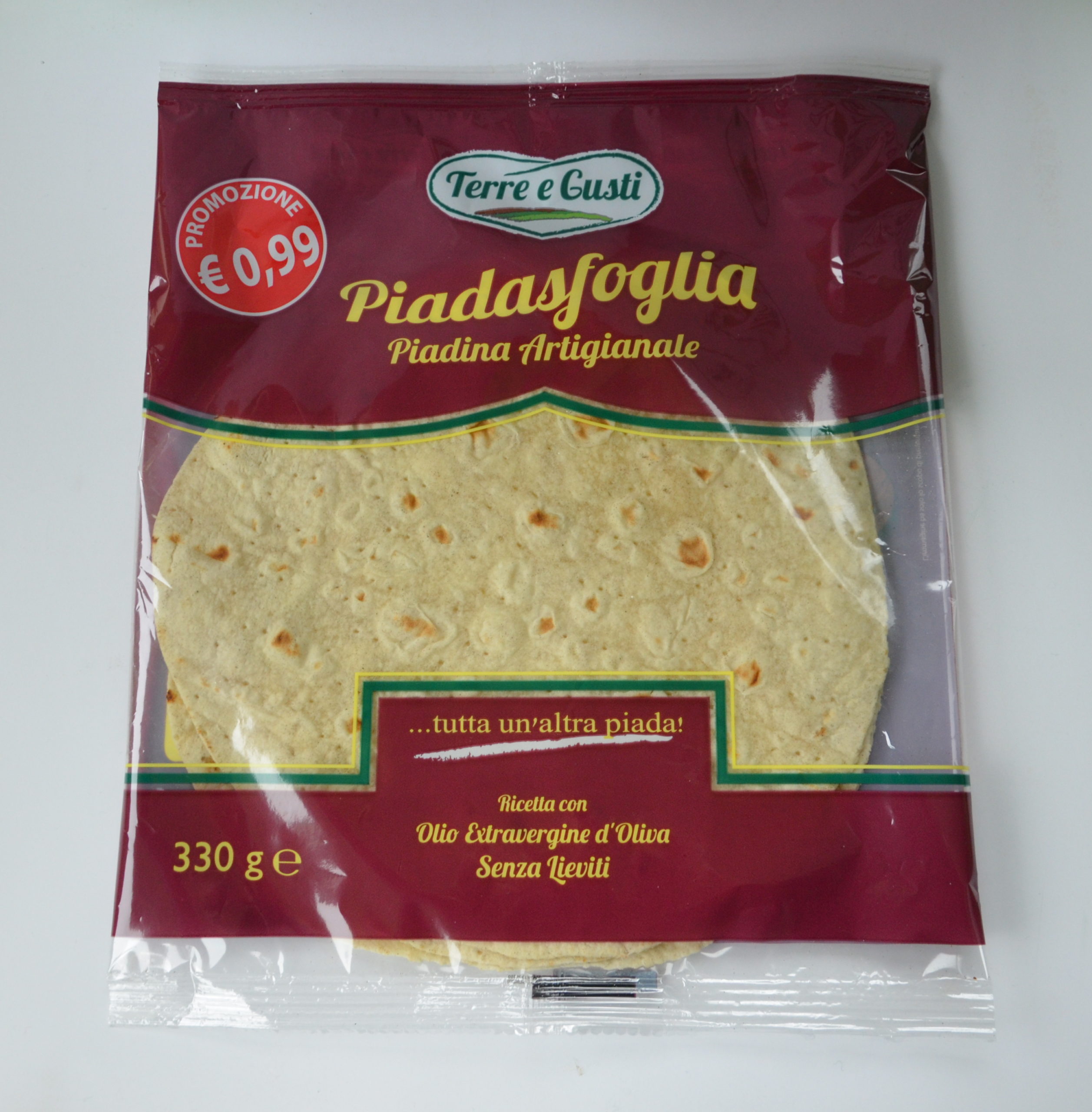 peso confezione: g 330 (3 piadine dal peso singolo di g 110)